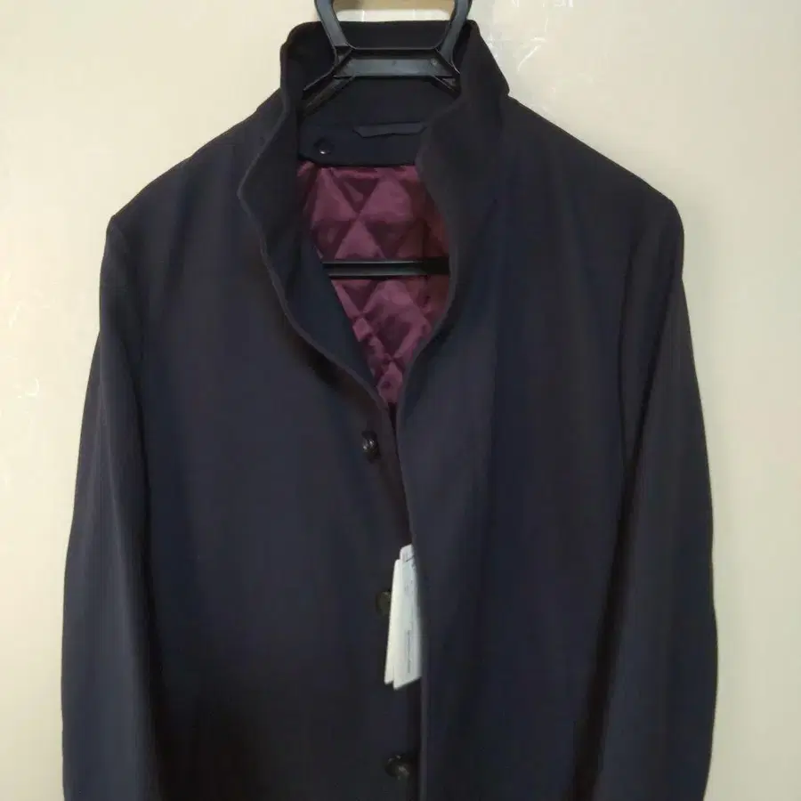 네이비 블루 스탠드 카라 코트, 버진 퀼팅 라이닝 포함. 수트 컴퍼니 (수트 스퀘어)에서 구매했습니다. - Color: Navy Blue - Lining Color: Burgundy - Features: Quilted lining, side pockets, button closure 방문해 주셔서 감사합니다.