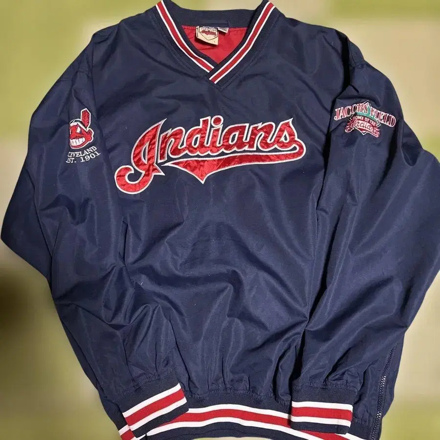 자수 로고가 특징인 네이비 색상의 나일론 자켓. - 브랜드: Cleveland Indians - 사이즈: L - 색상: 네이비 - 디자인: 스트라이프가 있는 리브 옷깃 - 특징: 자수 로고 - 소재: 나일론 - 스타일: 자켓 방문해 주셔서 감사합니다.