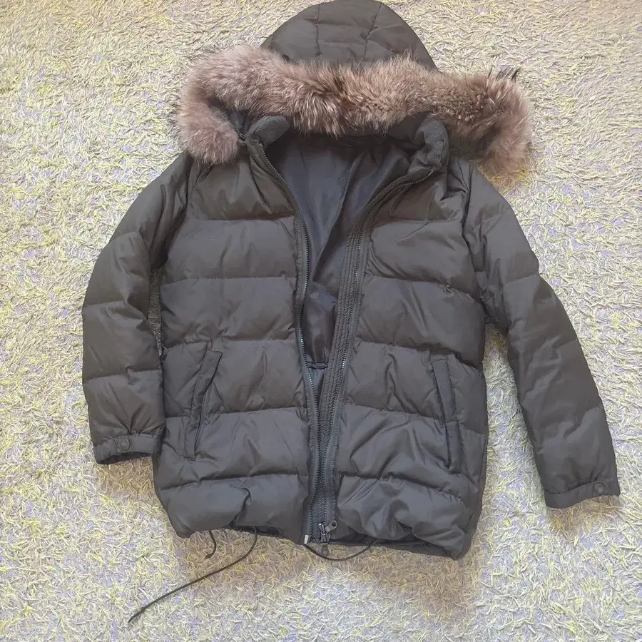 후드와 퍼가 달린 올리브 그린 다운 자켓입니다. 퀼팅 디자인으로 보온성이 뛰어납니다.