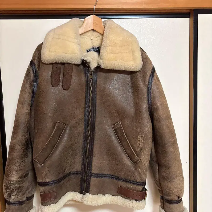 양가죽 소재의 보아 옷깃 플라이트 자켓, 허리에 벨트가 있어 스타일리시합니다.