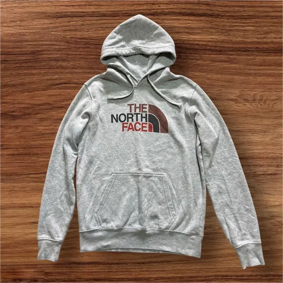 그레이 색상의 THE NORTH FACE 후드티, M 사이즈, 로고 디자인.