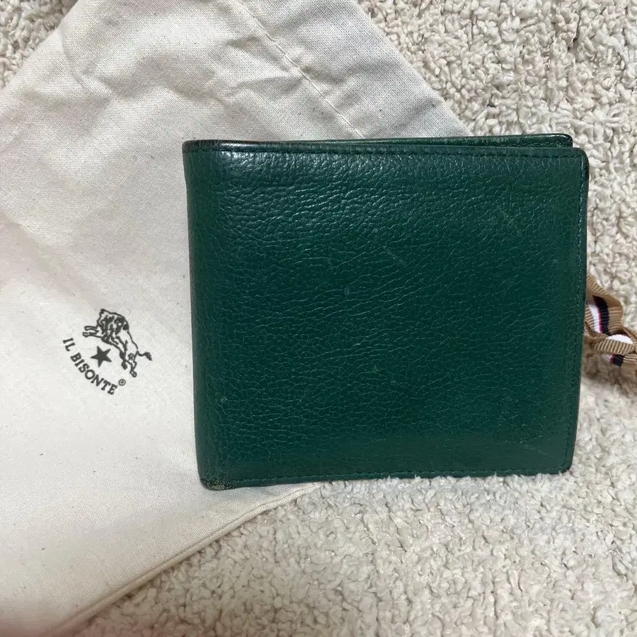 다크 그린 색상의 IL BISONTE 제조 2단 접이식 지갑입니다. 카드 포켓 3개, 프리 포켓 4개, 지폐 포켓 1개가 있습니다.