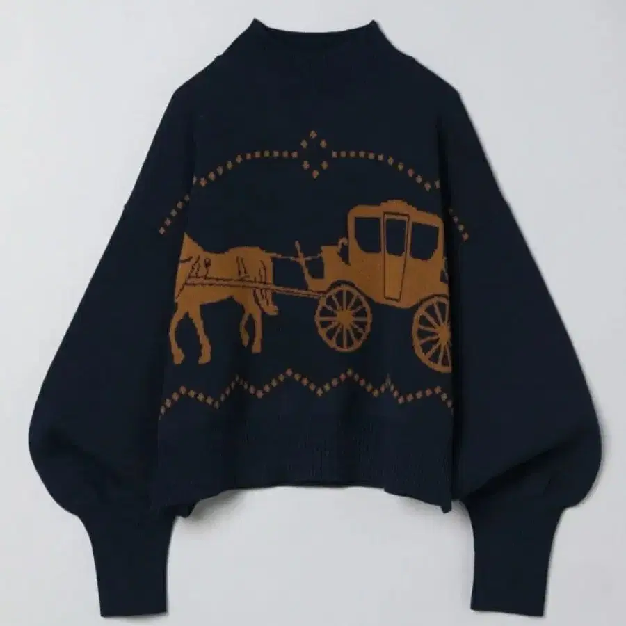 말과 마차 디자인이 특징인 네이비 니트 스웨터.