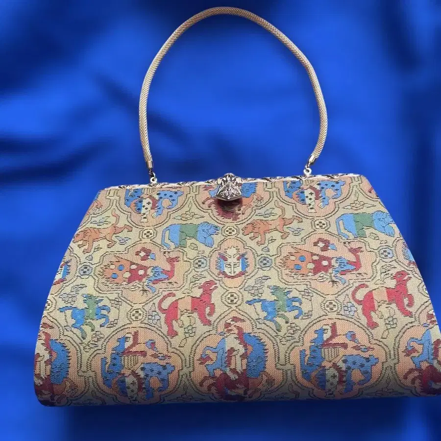 다색의 동물 무늬가 베풀어진 직물제의 기모노 가방, 장식적인 금속 클로징과 핸들 부착.