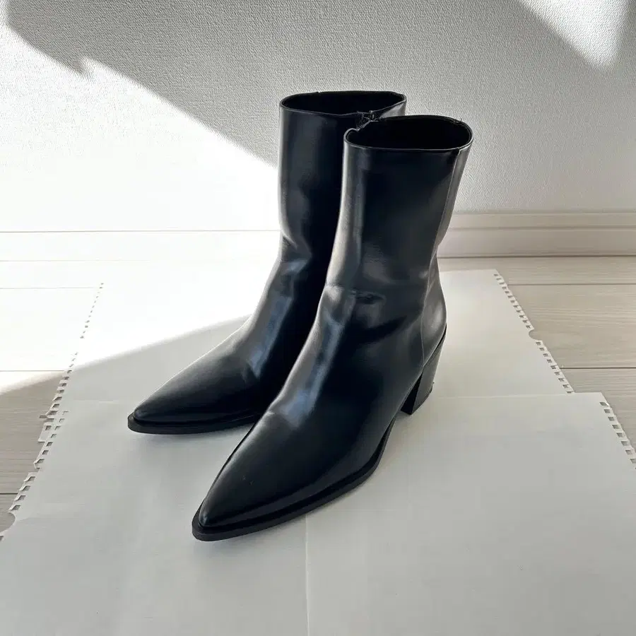 블랙 인조 가죽 소재의 스틸레토 부츠, 사이드 지퍼 부착.