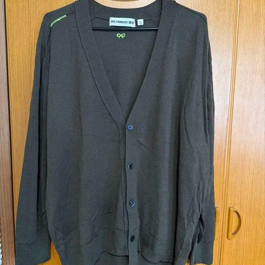 해당 상품은 UNIQLO ✖️ ANYA HINDMARCH 가디건입니다. XL 사이즈, 소매에 눈 디자인이 있습니다.