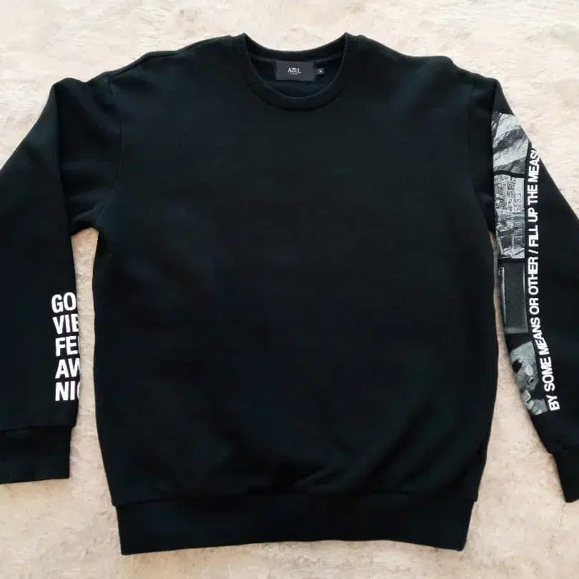 그래픽 프린트와 텍스트 디자인이 특징인 블랙 크루넥 맨투맨.