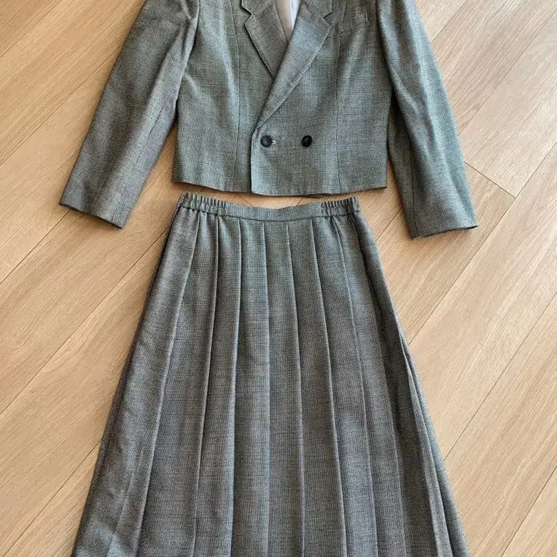 그레이 색상의 더블 브레스트 자켓과 플리츠 스커트 셋업