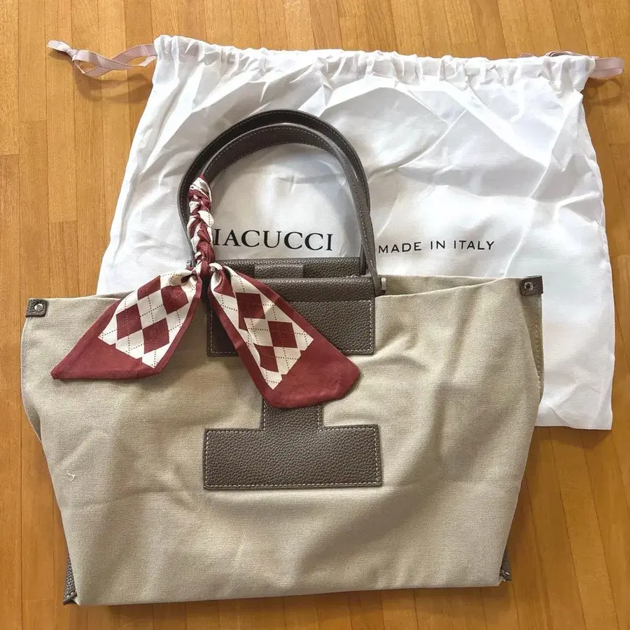 베이지 색상의 캔버스와 가죽 토트백, 스타일리시한 디자인.