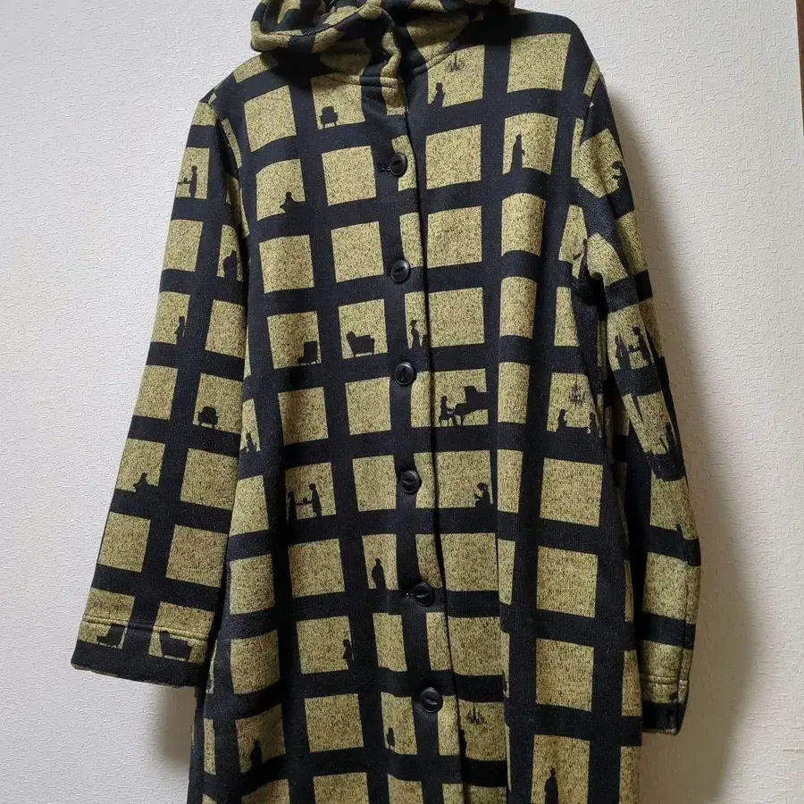 자동 번역되었어요. 원문보기후드 부착 체크 무늬 코트, 블랙과 베이지의 대비가 특징.