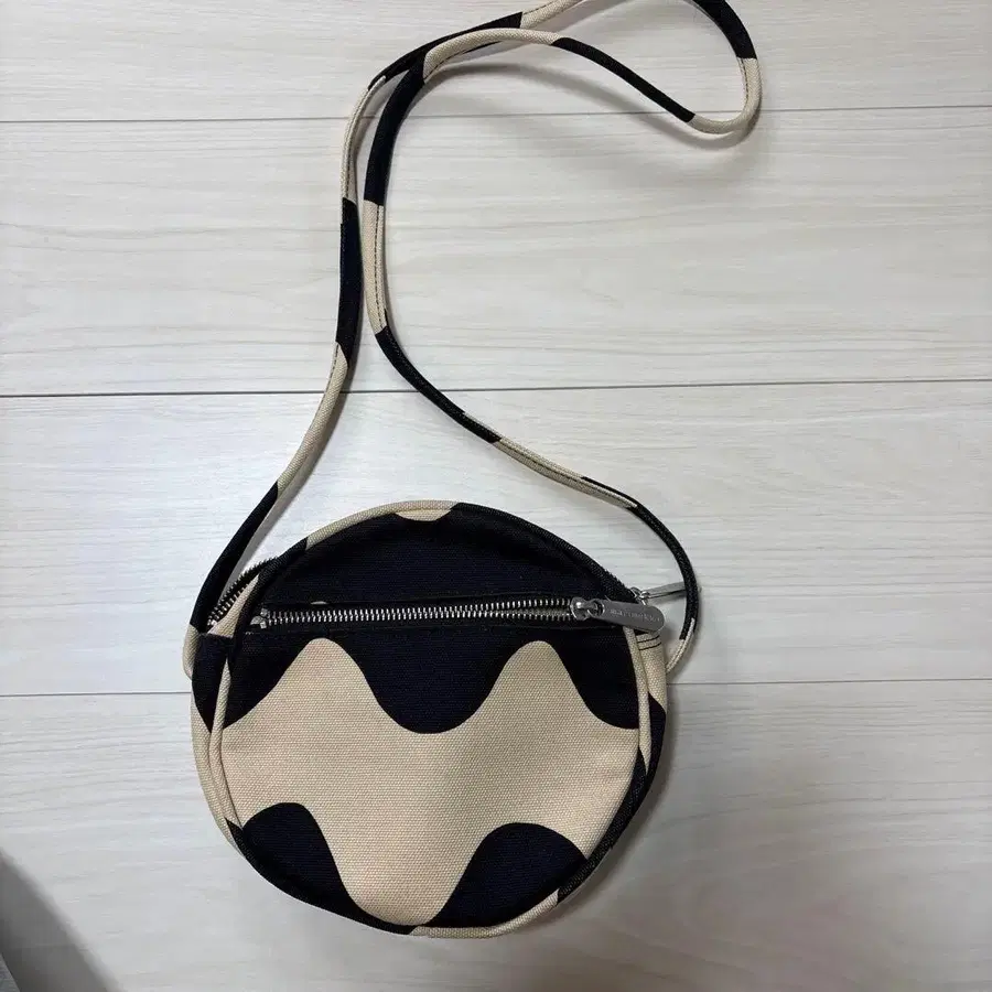 검은색과 베이지색 물결무늬가 특징인 원형 숄더백.