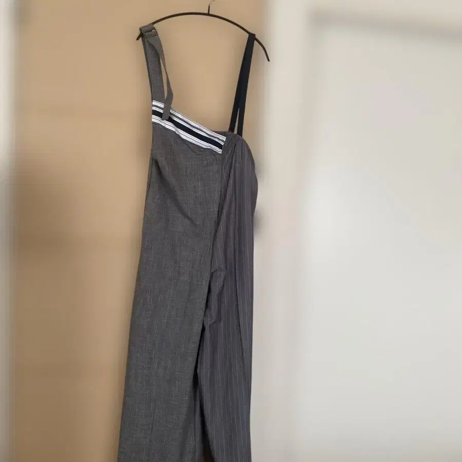 스트라이프 어깨끈이 특징인 그레이 와이드 팬츠 스타일 살로펫.