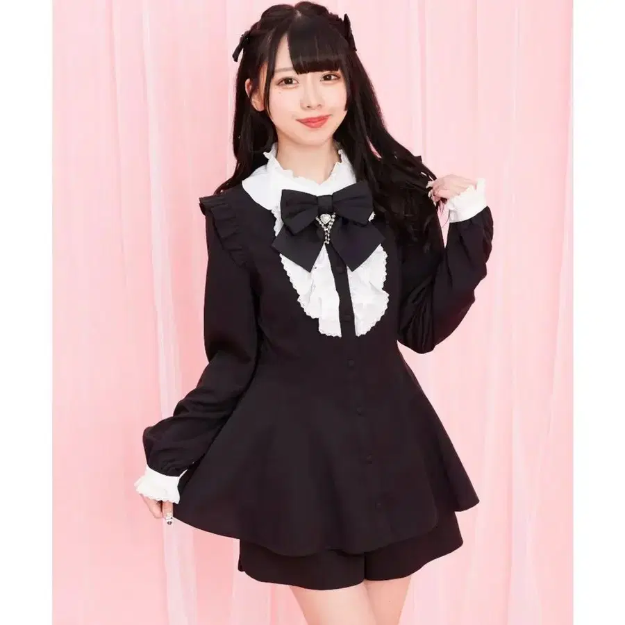 SecretHoney 액세서리 리본 레이스 프릴 셋업 블랙 반팔