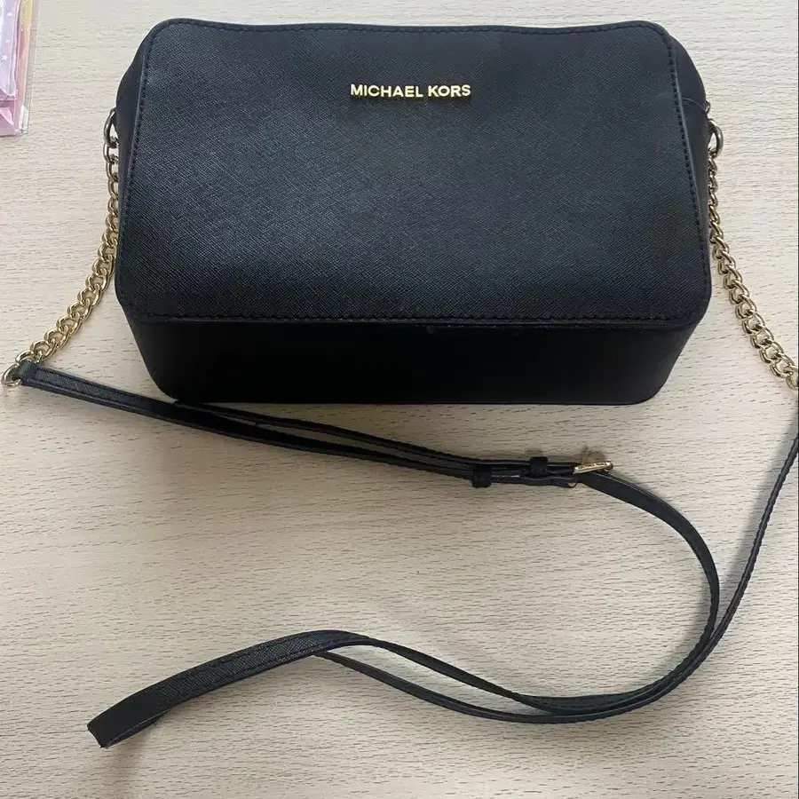 합성 피혁 소재의 블랙 숄더백, 조정 가능한 스트랩 포함.