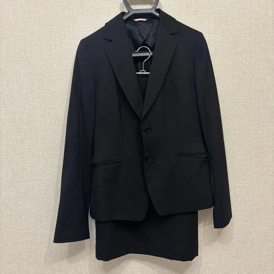 블랙 자켓과 스커트 세트의 여성용 취업 정장입니다.