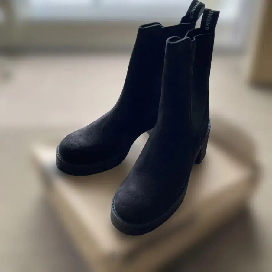 스웨이드풍의 블랙 사이드 고어 부츠, 약 7cm 힐로 신기 편한 디자인.