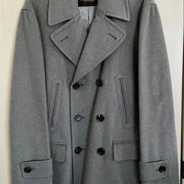 울 소재의 그레이 색상 더블 브레스트 피 코트.