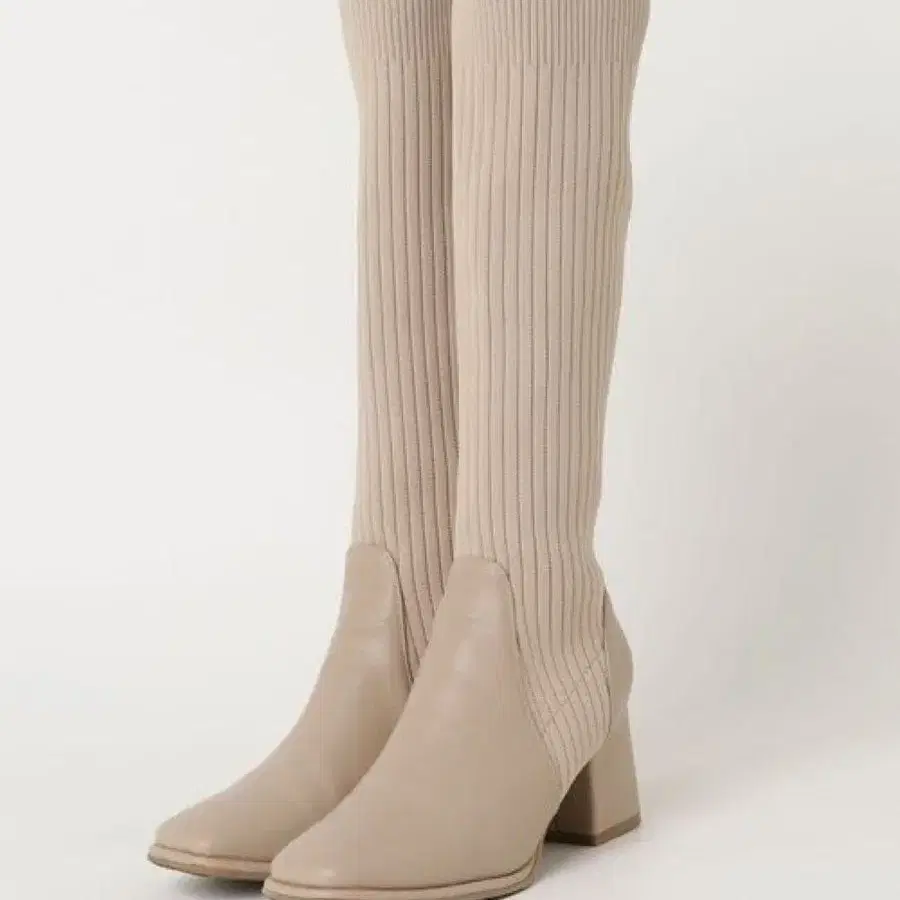합성 피혁과 니트 소재의 베이지 롱 부츠, 약 6.5cm 힐로 스타일리시합니다.