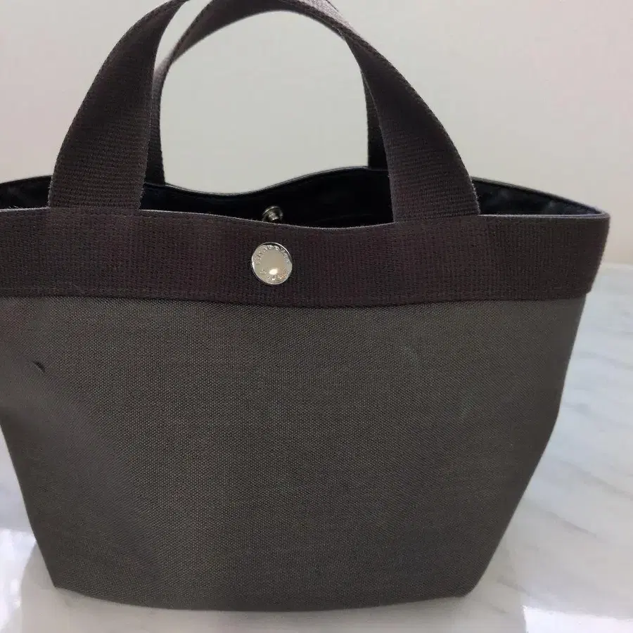 다크 그레이 캔버스 소재 토트백, 스냅 버튼이 있어 사용하기 쉬운 디자인.