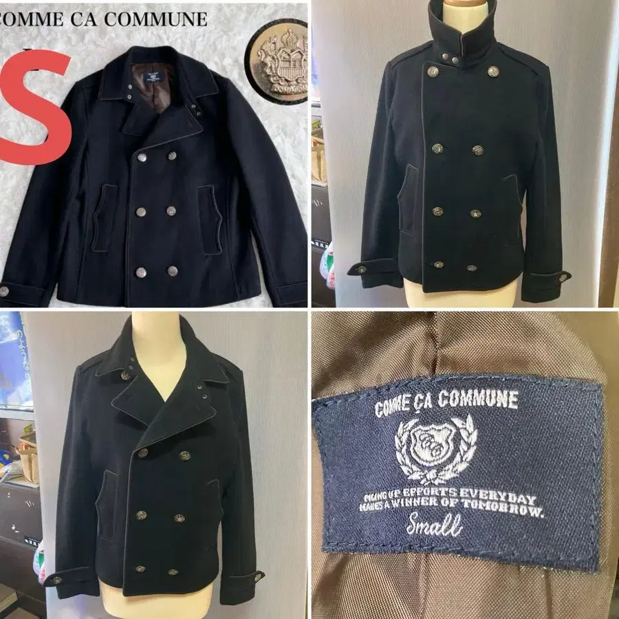 스탠드 카라와 메탈 버튼이 특징인 울 소재 더블 브레스트 피코트.