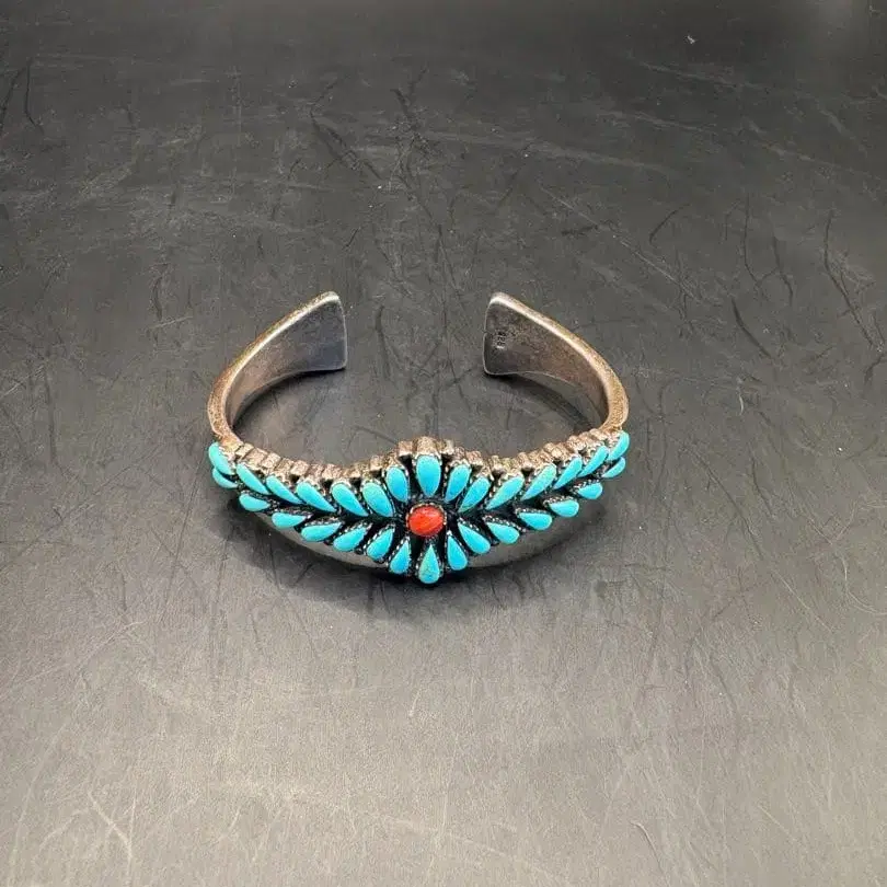 터콰이즈 블루 색상의 꽃잎 디자인 실버 뱅글. - 색상: 터콰이즈 블루와 빨간색 - 소재: 실버와 터콰이즈 - 디자인: 꽃잎 모양의 장식 - 스타일: 오픈 뱅글 - 스톤: 코랄과 터콰이즈 방문해 주셔서 감사합니다.