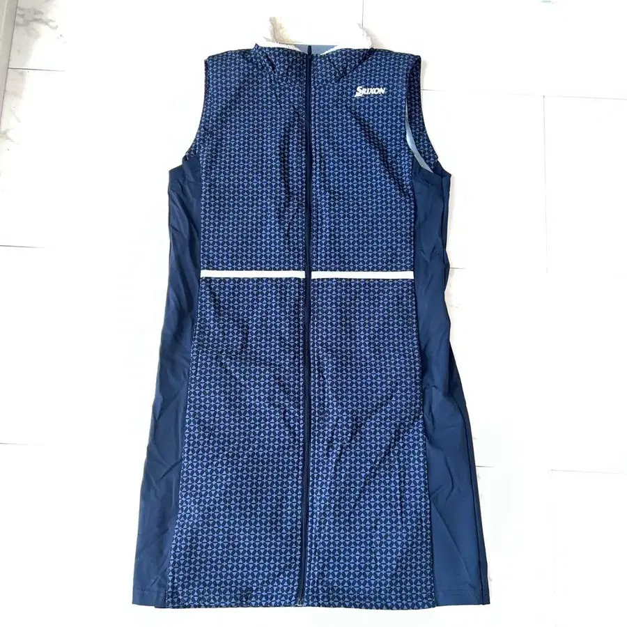 지퍼와 플리스 옷깃이 있는 네이비 색상의 충전솜 원피스.