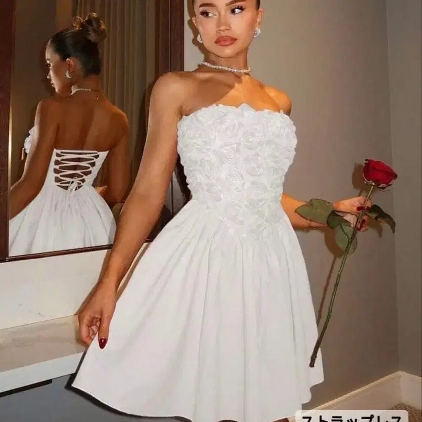 스트랩리스 디자인의 화이트 드레스, 화려한 플라워 장식 포함.