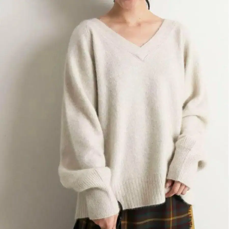 폭스 혼방 V넥 니트 드롭 숄더
