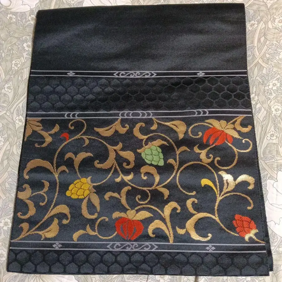 블랙 베이스에 화려한 꽃+덩굴 패턴이 장식된 나고야 오비입니다.