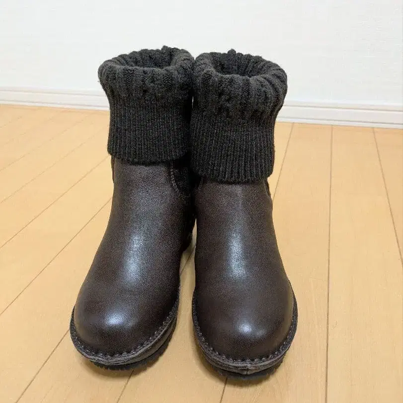다크 브라운 색상의 가죽과 니트 소재의 웨지솔 부츠, 캐주얼 스타일에 최적.