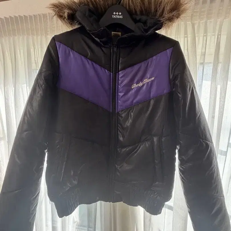퍼가 달린 후드와 컬러 블록 디자인이 특징인 다운 자켓.