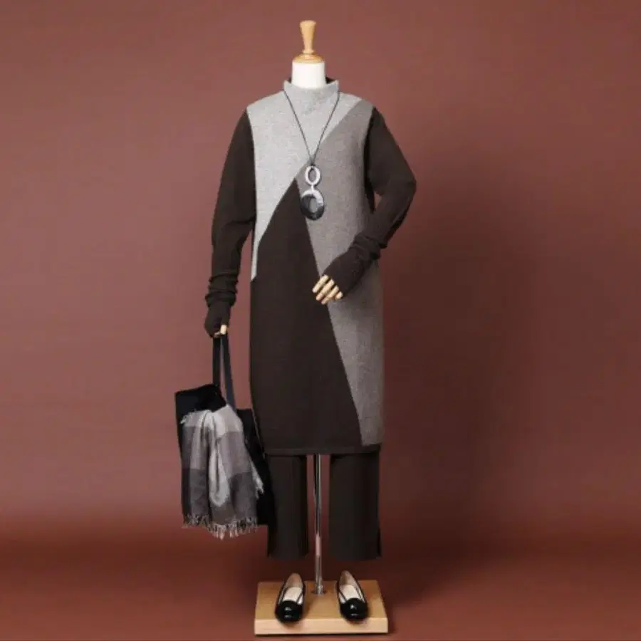 자동 번역되었어요. 원문보기기하학 패턴의 하이넥 니트 원피스, 그레이와 브라운의 콤비네이션.