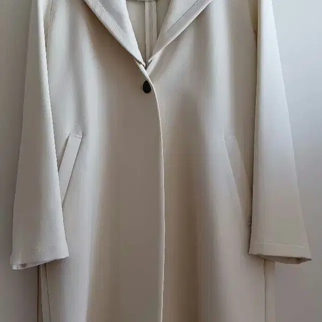 후드 부착 아이보리 스프링 코트, 사이드 포켓이 있고 텍스처가 있는 원단.