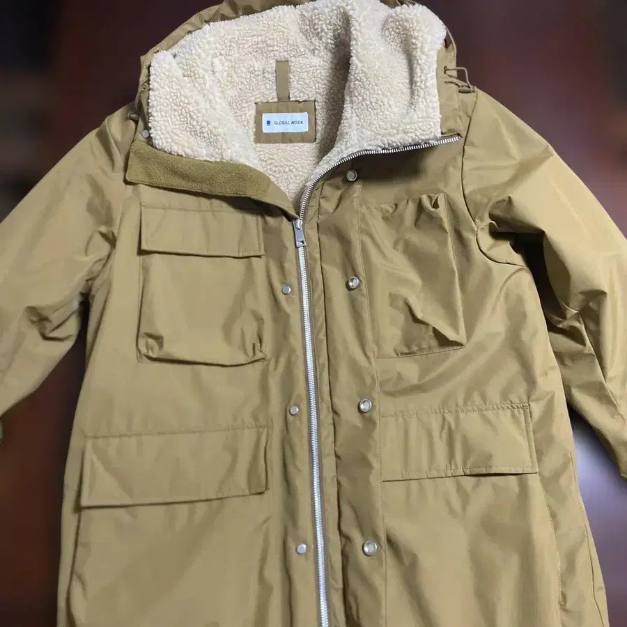 후드 부착 베이지색 마운틴 후드티, 보아 안감으로 따뜻함을 제공합니다. - 브랜드: GLOBAL WORK - 색상: 베이지 - 소재: 외부: 나일론, 안쪽: 보아 - 특징: 후드 부착, 지퍼 개폐, 포켓 부착 방문해 주셔서 감사합니다.