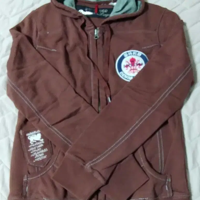브라운 색상의 후드 부착 후드티, 자수 로고 포함.