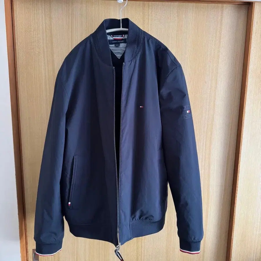 네이비 컬러의 스탠드 카라, 사이드 포켓이 있는 TOMMY HILFIGER 자켓.