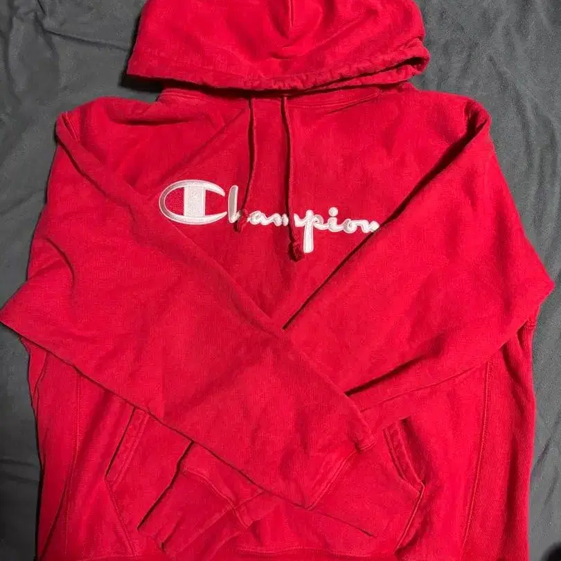 프론트에 Champion 로고 자수가 들어간 핑크빛이 도는 레드 색상의 후드티.