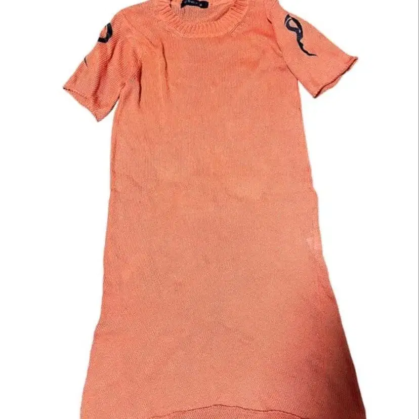 gomme의 시스루 니트 반팔 원피스 사이즈 기재 없음 어깨 너비 37cm 가슴 너비 43cm 기장 88cm 양 어깨 프린트 희미한 늘어짐 있음 색상은 오렌지