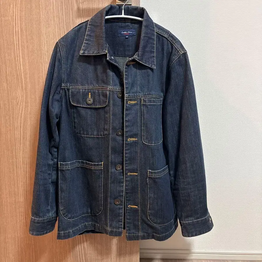 데님 자켓, M 사이즈, 버튼 프론트와 포켓 부착. - 브랜드: Cattle Horn BOBSON - 사이즈: M - 색상: 다크 블루 - 소재: 면 100% - 디자인: 버튼 프론트, 포켓 부착 사이즈 - M 커버올