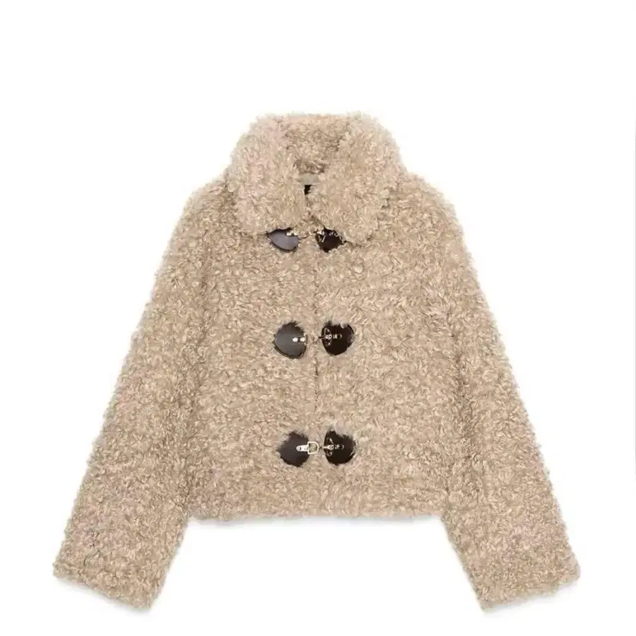 부드러운 보아 소재의 베이지 자켓, 버튼이 달린 크롭 기장.