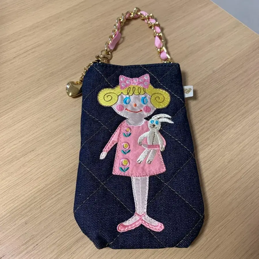 데님 원단에 자수로 귀여운 여아 디자인의 파우치.