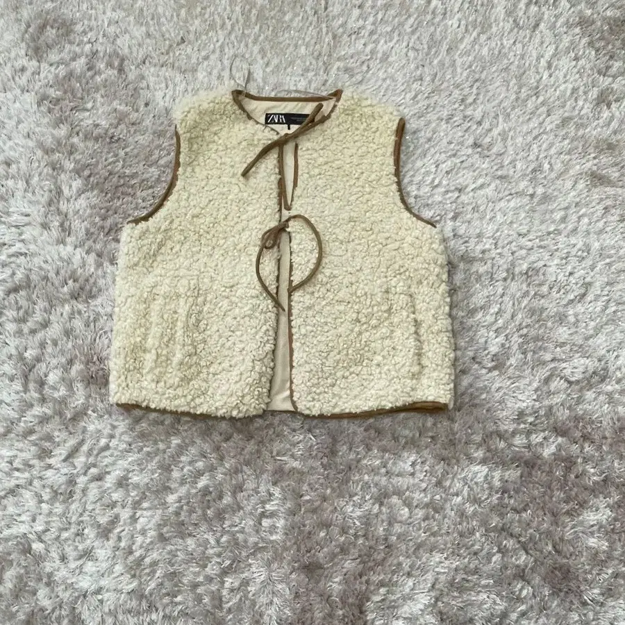 자동 번역되었어요. 원문보기ZARA의 아이보리 보아 소재, 리본이 달린 베스트입니다. XS 사이즈입니다.