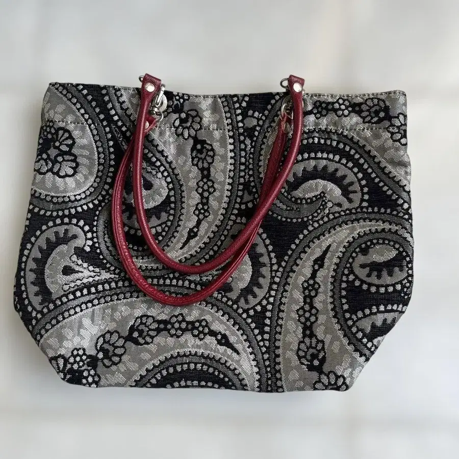 페이즐리 무늬 토트백, 안쪽에 탈부착 가능한 지퍼 포켓 부착.