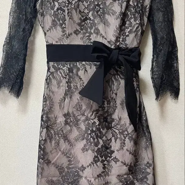 레이스 소재의 타이트 핏 드레스, 긴팔 디자인으로 엘레강트한 인상을 줍니다.