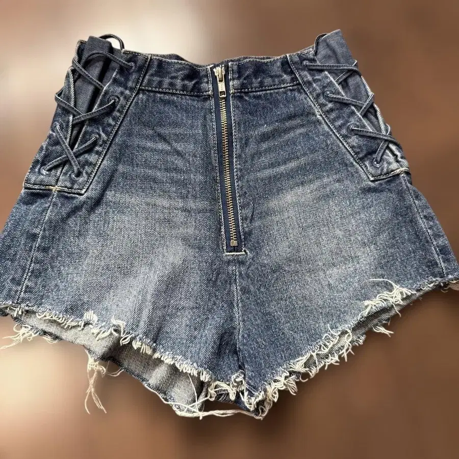 사이드 레이스업 디자인의 프린지 장식 다크 블루 숏팬츠.