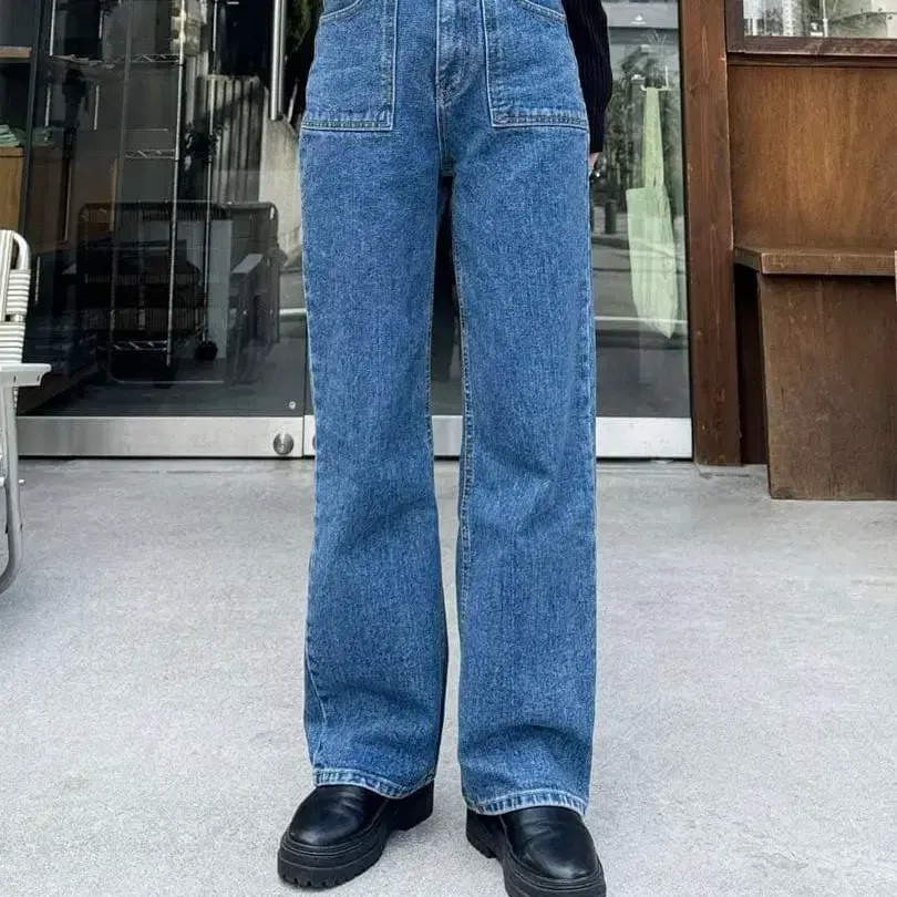 지유 와이드 데님 팬츠 블루 하이웨스트
