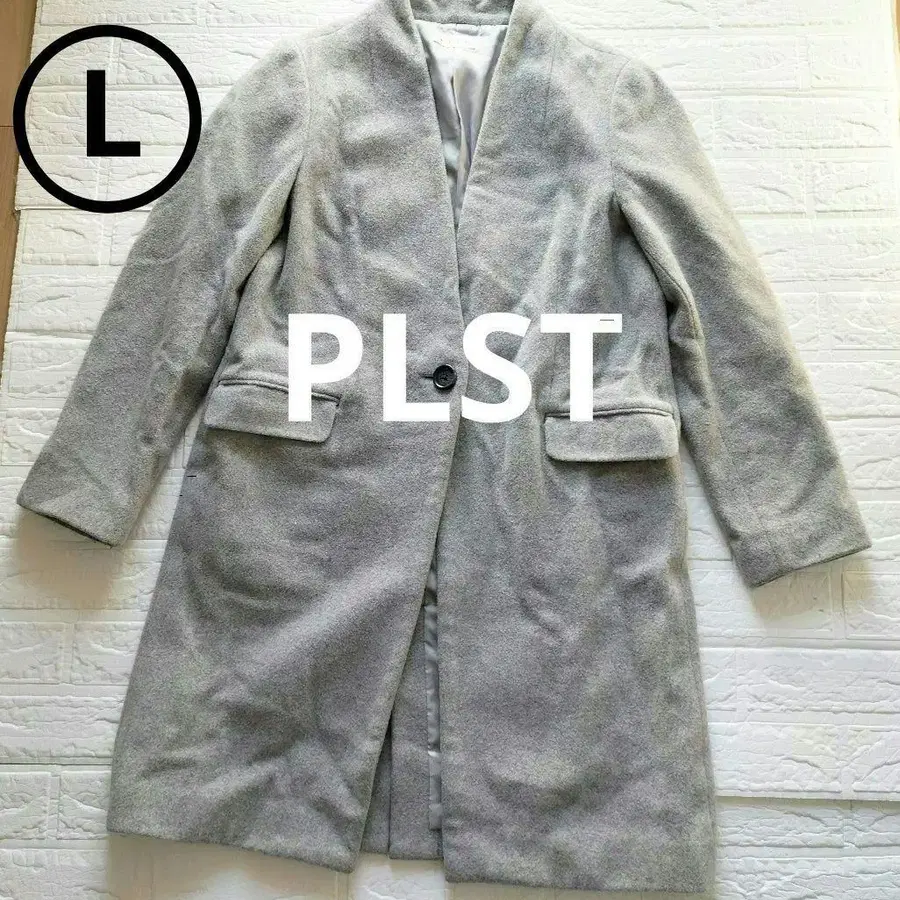 심플하고 엘레강트한 그레이 롱 코트, 버튼과 앞면 포켓이 있습니다.