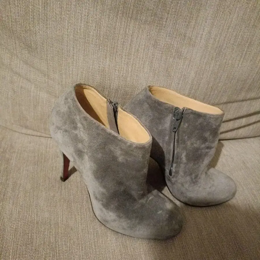 스웨이드 소재의 그레이 하이힐, 지퍼 디자인. - 색상: 그레이 - 소재: 스웨이드 - 디자인: 지퍼 - 굽 높이: 하이힐 방문해 주셔서 감사합니다. 사이즈 - 24cm