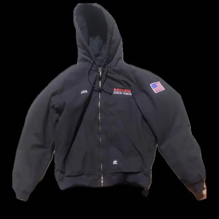 후드 부착 BERNE제 자켓, 미국 국기 패치 부착, L 사이즈.