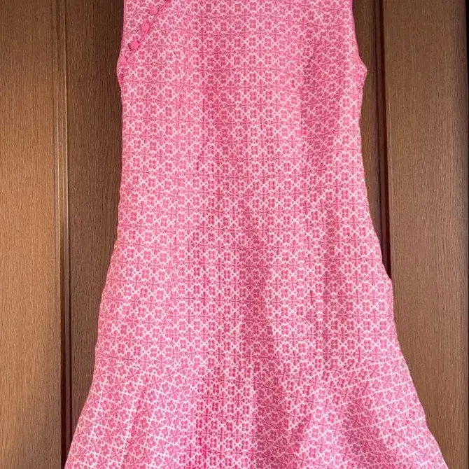 핑크와 화이트 패턴의 슬리브리스로, A라인으로 퍼지는 미니 기장의 플레어 원피스입니다. 차이나 칼라와 사선으로 배치된 버튼은 차이나 드레스의 요소를 접목했습니다.